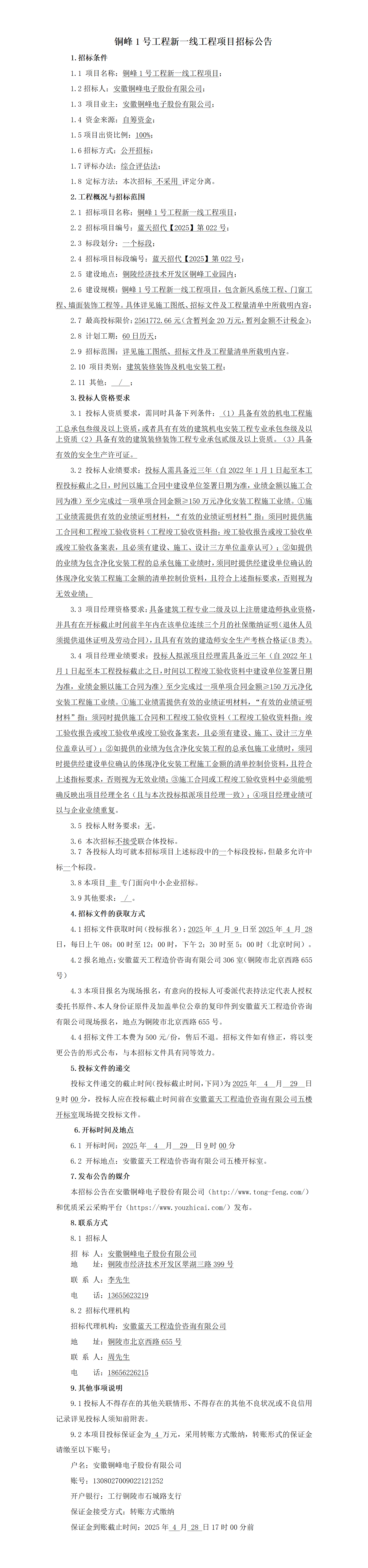銅峰1號工程新一線工程項(xiàng)目招標(biāo)公告