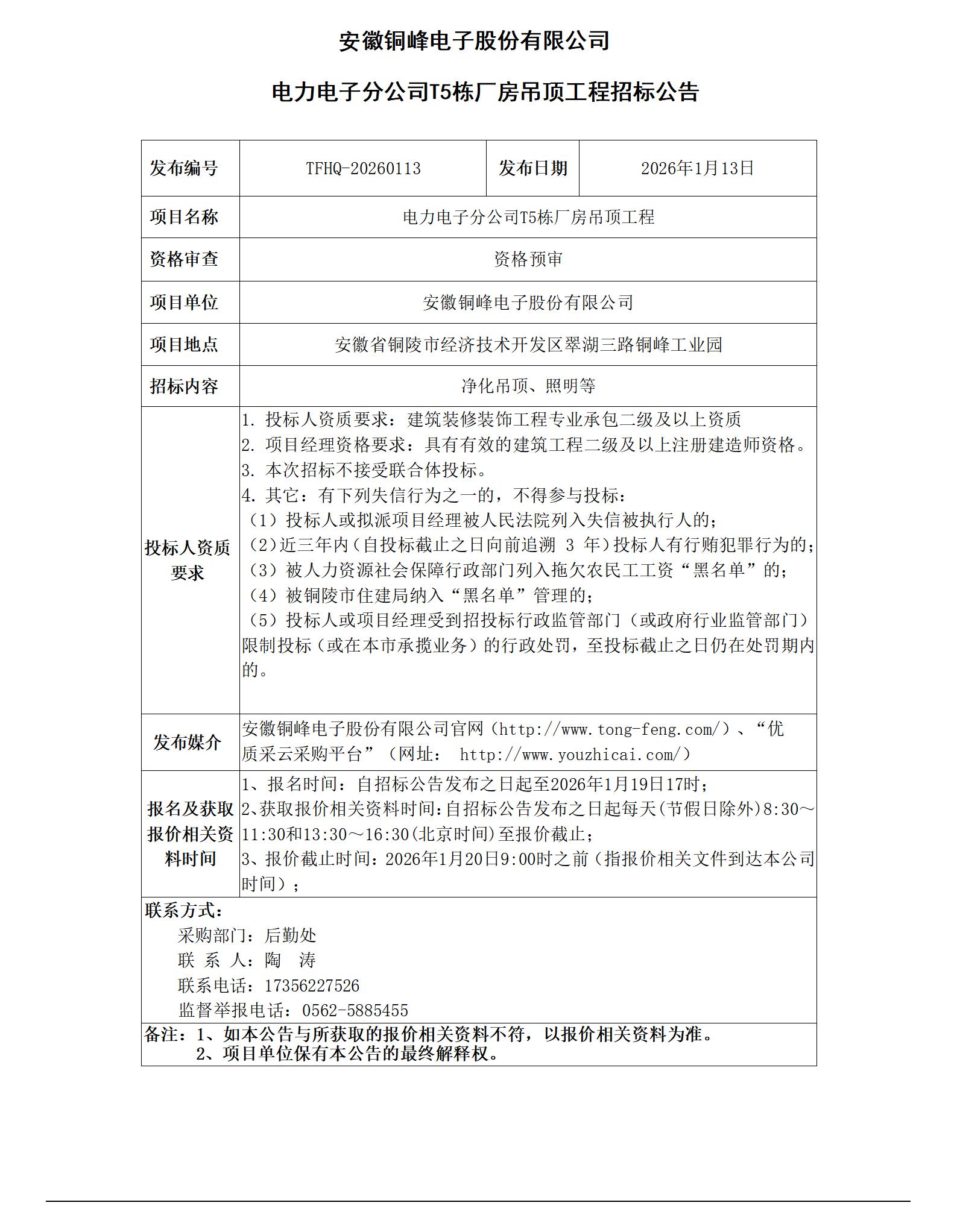 01安徽銅峰電子股份有限公司 (電力電子分公司T5棟廠房吊頂工程 招標公告)_01