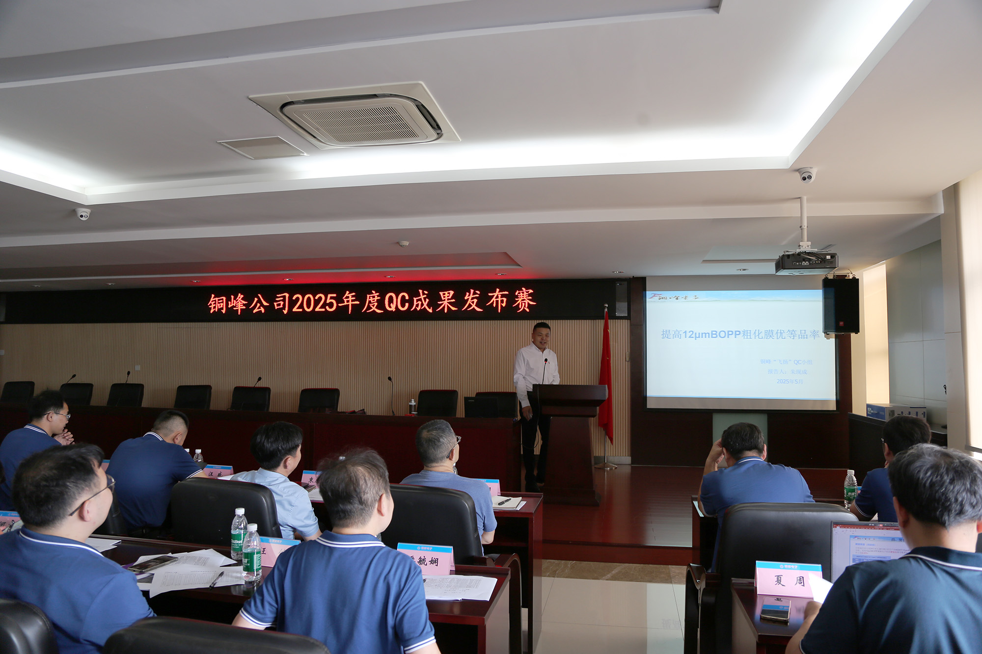 為確保評審的專業(yè)性與公平性,本次發(fā)布會由公司技術質(zhì)量專家組成專業(yè)評審團。評委們從項目選題的針對性、問題分析的科學性、改進措施的有效性、成果效益的顯著性以及現(xiàn)場發(fā)布表現(xiàn)等多個維度對各項目進行了嚴格、綜合的評分,并逐一給予了細致點評。評審既充分肯定了各小組的努力付出與突出貢獻,也針對性地提出了極具建設性的改進建議。經(jīng)評委獨立打分,薄膜分公司《提高12μmBOPP粗化膜優(yōu)等品率》項目成果榮獲一等獎,銅愛公司《提高超寬膜分切優(yōu)等品率》項目成果榮獲二等獎,配件分公司《提高橢圓型鋁殼合格率》、電容器分公司《提高引線壓接端子合格率》、鍍膜分公司《消除金屬化膜卷邊現(xiàn)象》等三個項目成果榮獲三等獎。