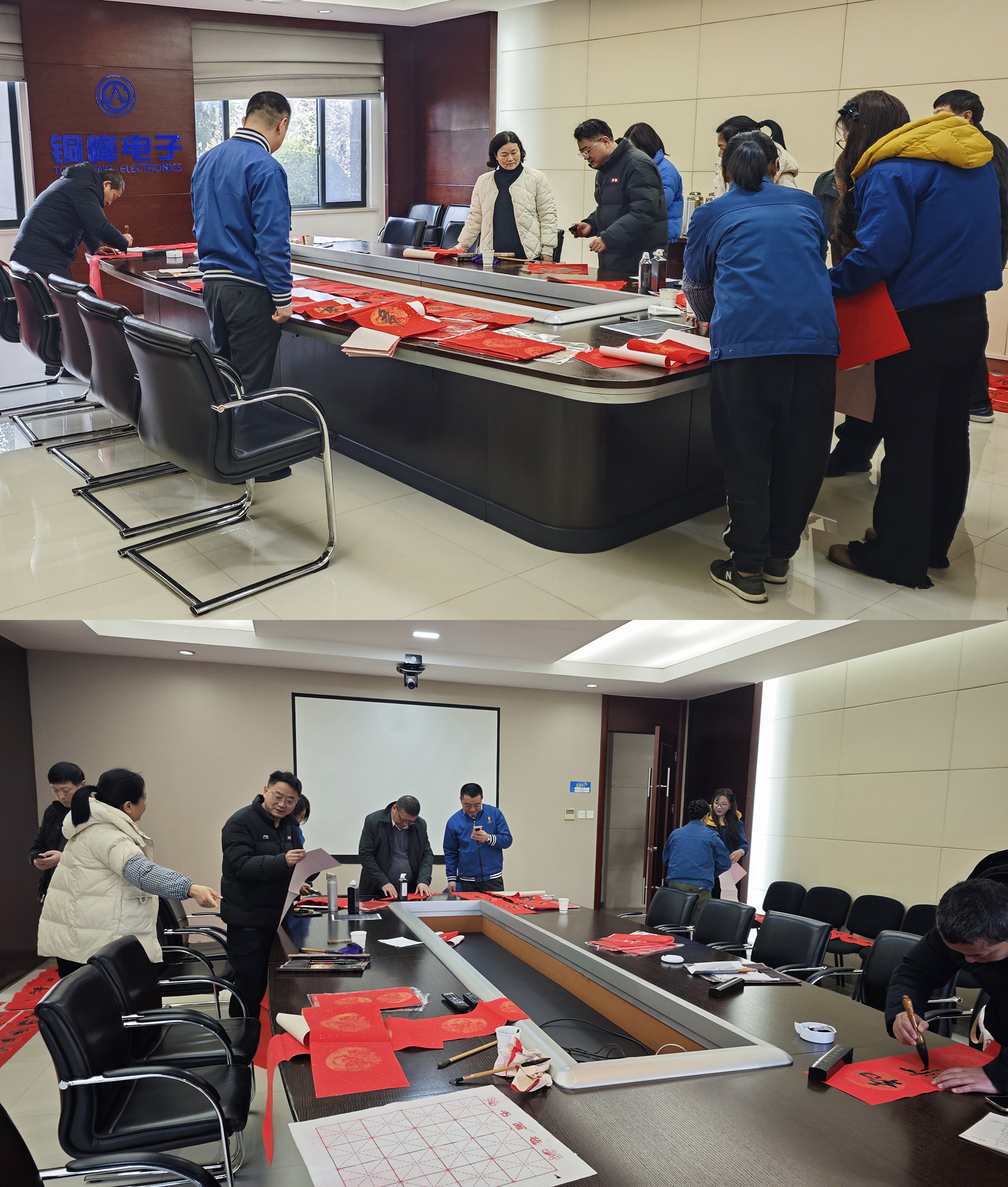 臘月二十四,在公司辦公樓一樓會(huì)議室,公司工會(huì)組織書(shū)法愛(ài)好者開(kāi)展“迎新春、送春聯(lián)”活動(dòng)。現(xiàn)場(chǎng)暖意融融、墨香四溢,職工們挑選或訂制自己心儀的佳句,一副副飽含吉祥寓意的春聯(lián)、一張張充滿(mǎn)喜慶的“?!弊周S然于紅紙上,增添了濃濃年味。