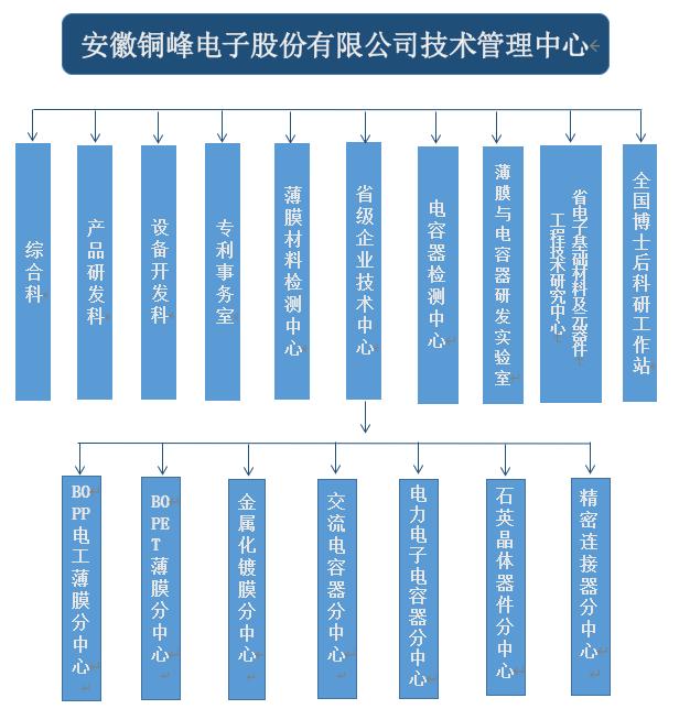 銅峰公司為國家高新技術(shù)企業(yè)、國家火炬計劃重點高新技術(shù)企業(yè)、國家火炬計劃銅陵電子材料產(chǎn)業(yè)基地重點骨干企業(yè)。公司建有完整的科研創(chuàng)新組織體系,設立技術(shù)管理中心作為技術(shù)研發(fā)的總管理機構(gòu),組織協(xié)調(diào)公司的各分子公司和相關(guān)部門,以確保公司技術(shù)創(chuàng)新精確高效地運行。技術(shù)管理中心下設綜合科、產(chǎn)品研發(fā)科、設備開發(fā)科、專利事務室、薄膜材料檢測中心、電容器檢測中心以及薄膜與電容器研發(fā)實驗室,同時下設省級企業(yè)技術(shù)中心、安徽省電子基礎材料及元器件工程技術(shù)研究中心以及國家級博士后科研工作站。